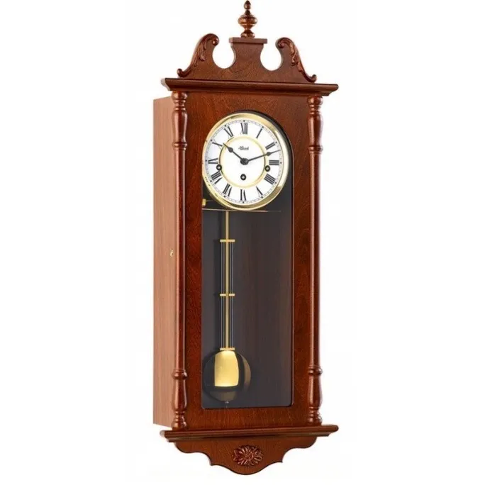 This is done by the nut on the bottom of the pendulum. Often at the pendulum bob is a collar with a V notch in it, if it has one make sure the bob is always sitting correctly in the notch. If there are two nuts under this, then one is used to tighten the bottom nut against it. Turn the nut to the right (clockwise) to go faster and to the left (anti clockwise) to go slower. The shorter a pendulum is the faster the clock goes. To slow a clock down, make the pendulum longer by adjusting the ‘rating’ nut below the pendulum. Just one revolution in the required direction per day and always reset the hands to time. Patience is required to achieve results, do not rush the process.